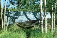 The "All in One" system is so named because it has all the elements of your hammock suspension combined in one continuous unit. Your slings are connected to your webbing using the fixed eye and a rope thimble. The adjustable end is connected to an aluminum ring which also has a continuous loop which you will use to attach the system to your hammock.